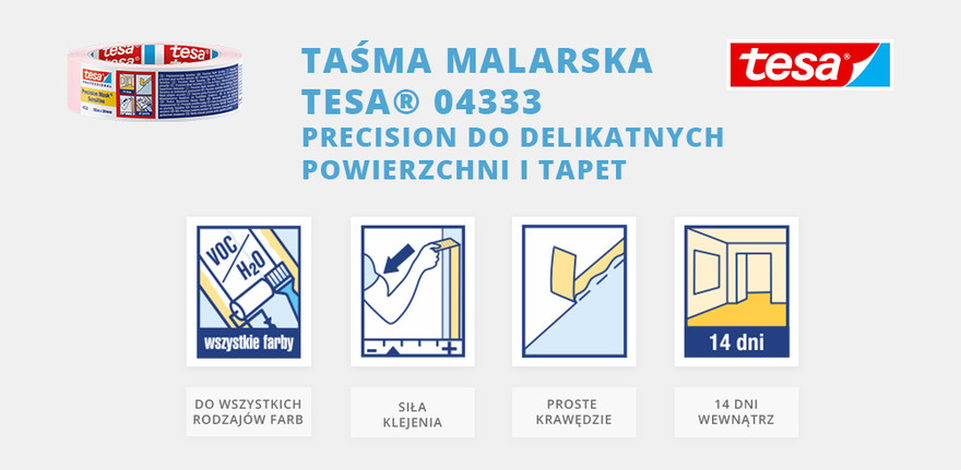 Taśma 04333 (różowa) dedykowana jest do prac malarskich na wrażliwych powierzchniach, takich jak  tapety czy ściany o niestabilny podłożu. Jako profesjonalna taśma maskująca jest niezwykle delikatna, ale nadal odpowiednio trzyma się maskowanej powierzchni, dzięki czemu uzyskujemy ostre krawędzie. Oszczędzając czas, taśmę można stosować również na lekko wilgotne ściany pomiędzy kolejnymi warstwami malowania.