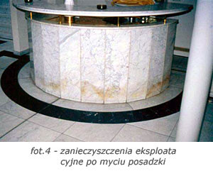 - zanieczyszczeniami eksploatacyjnymi (np. czerwone wino rozlane na jasnym marmurze, niewłaściwe środki lub metoda czyszczenia - fot. 4),