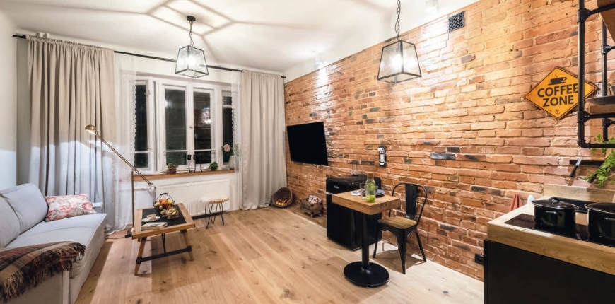 Stare budownictwo przyciąga wielbicieli mieszkań o nietypowych rozwiązaniach przestrzennych i dawnych detali architektonicznych. Wielką wartość aranżacyjną ma tu przede wszystkim przestrzeń, którą można urządzić w tak modnym dzisiaj stylu eklektycznym. Ale ogromnym atutem mogą być również widoczne elementy instalacyjne, takie jak miedziane rury czy konstrukcyjne, takie jak autentyczne ceglane mury. To właśnie dzięki nim mieszkania w kamienicach to drugi po pofabrycznych wnętrzach typ lokali, gdzie niewielkim wysiłkiem wykreujemy pomieszczenia w stylu industrialnym. Taki właśnie potencjał aranżacyjny zobaczyła również nowa nabywczyni starej stróżówki na warszawskiej Pradze. Wprawne oko konesera szybko wychwyciło atuty lokalu: ponadstandardową wysokość przekraczającą 3 metry i starą stolarkę okienną zachowaną w takim stanie, że można było podjąć się jej wyremontowania. Kiedy pani Grażyna dowiedziała się, że kamienica nie była zburzona podczas wojny, dzięki czemu ma oryginalne ceglane mury, również i w nich zobaczyła szansę – odsłonięta oryginalna stara cegła jest podstawą tak modnego dzisiaj stylu loftowego! Wystarczyła więc chwila rozmowy z poprzednim właścicielem i rzut oka na zrujnowaną stróżówkę, by wiedzieć, że naprawdę niewielkim sumptem można przeobrazić ją w oryginalnie urządzone lokum do wynajęcia turystom.