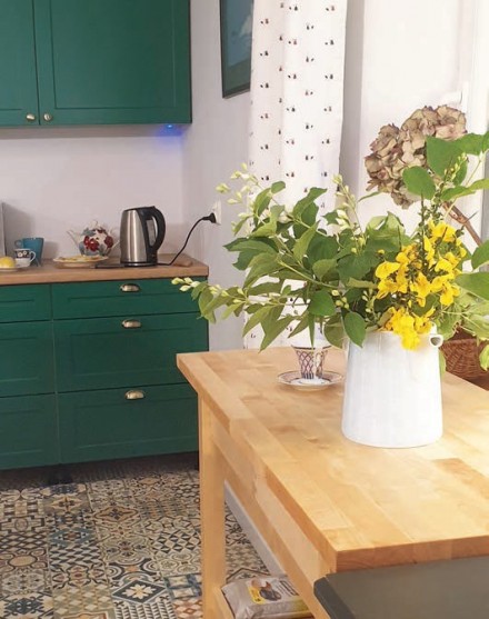 Często podczas remontu kuchni mamy pokusę dokonania w niej całkowitej rewolucji. Tymczasem zmian może wymagać tylko funkcjonalność i design zabudowy, a nie sam układ szafek oraz sprzętów. W tym przypadku kuchenny aneks oddzielony był od salonu murkiem, którego zadaniem było między innymi ukrycie ciągu roboczego. W murku były również instalacje wodno-kanalizacyjne. Szafki do przechowywania produktów i naczyń oraz lodówka umieszczone były na przeciwległej ścianie. Po długich debatach właściciele postanowili kupić całkowicie nowe wyposażenie, ale zostawić ten sam układ zabudowy. Pozostawienie murku pozwoliło uniknąć kosztownych zmian, związanych z przenoszeniem instalacji. Planując nową zabudowę, zrezygnowali jednak z szafek narożnych, kierując się przekonaniem, że proste ciągi zabudowy znacznie ułatwiają korzystanie z mebli. Dzięki precyzyjnemu rozplanowaniu wnętrz szafek poprawiła się także funkcjonalność kuchni. Dolne szafki zamykane drzwiczkami zastąpiono szufladami, które ułatwiają dostęp do produktów i naczyń. Liczbę szafek ograniczono do minimum – tutaj musi się zmieścić jedynie to, co niezbędne podczas kucharzenia na letnisku. Odzyskaną przestrzeń wykorzystano za to na większą lodówkę oraz zmywarkę. Dodatkowe miejsce do przechowywania i pracy zapewniają stoliki pomocnicze – barki na kółkach – jeden stanął między zabudową a lodówką, drugi pod oknem przy wejściu do aneksu. Spojrzenie na kuchnię z perspektywy saloniku przyciąga uwagę efektowną szmaragdową zabudową i turkusową lodówką w stylu retro. Będąc w środku aneksu, widzimy nowoczesną przestrzeń roboczą, a pracując przy niej mamy perspektywę na atrakcyjny pokój dzienny oraz zieleń ogrodu za jego oknami. Dawne położenie zabudowy nabrało nowego wymiaru. W takiej kuchni aż chce się gotować!