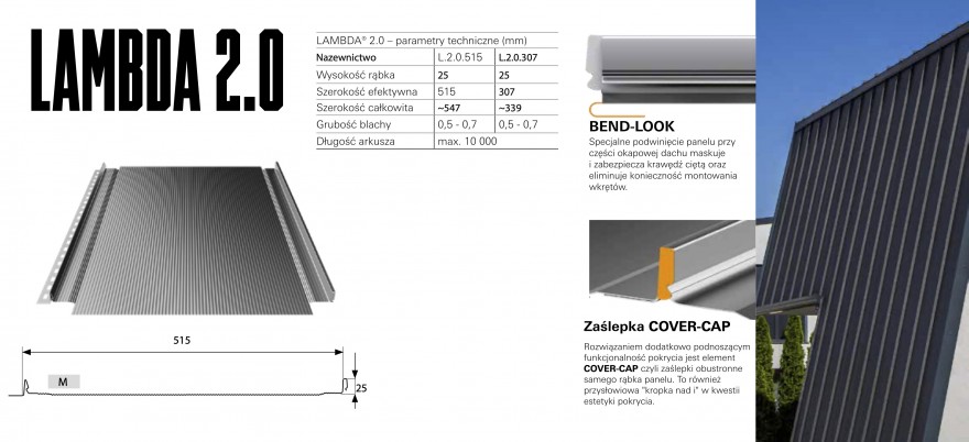 - LAMBDA 2.0 dostępna jest w dwóch szerokościach panelu 515 mm oraz 307mm i czterech rodzajach profilowania, co pozwala na idealne dopasowanie do potrzeb konkretnego budynku.