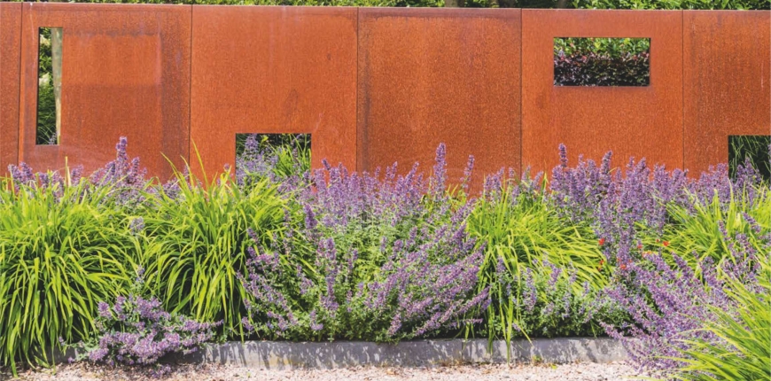Industrialna estetyka, tak modna w ostatnich czasach w wystroju wnętrz, ma również silną reprezentację w nowoczesnych aranżacjach ogrodów. Styliści przestrzeni zielonych coraz odważniej wyznaczają miejsca na tak nietypowe dotąd elementy jak ściany, przesłony, monolity. Te, pozornie nie mając uzasadnienia funkcjonalnego, staję się jednak niezwykle ciekawym tłem-ekranem kontrastującym z posadzonymi w jego sąsiedztwie roślinami. Pojawiają się więc drewniane ażurowe parawany, panelowe trejaże z tworzywa czy gabionowe murki. Hitem stają się metalowe, skorodowane albo lustrzane ścianki. To prawdziwe designerskie nowum. Pokryte rdzą panele, słupy i  ekrany stanowią niezwykle ciekawy barwny kontrast dla zieleni, ale również wspaniale grają z  odmianami roślin o płomiennych rudych kwiatach, stanowiąc jednolity kolorystycznie klimat. Drugim top trendem staje się odważne umieszczenie w ramach ogrodu luster. Specjalnie produkowane na ten cel wykonywane są z trwałego, odpornego na warunki atmosferyczne akrylu. Są to produkty lekkie i zdecydowanie wytrzymalsze niż lustra szklane. Dają niezwykle ciekawy efekt, powiększając optycznie przestrzeń naszego ogrodu, a jednocześnie stwarzając efekt trójwymiarowości. Lustra w ogrodzie odbijają dodatkowo światło tworząc świetlne refleksy, a także podkreślają grę barw kwiatów na rabatach.