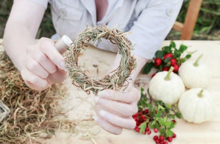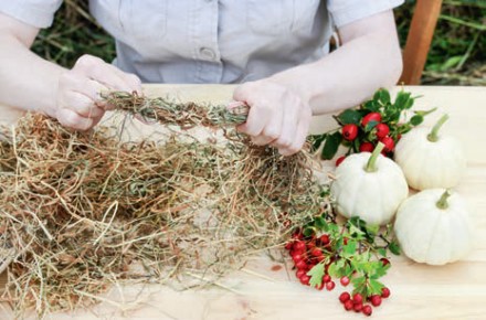 1. Do przygotowania tej minimalistycznej, ale jakże sielskiej dekoracji potrzebne będą: nić pasmanteryjna lub florystyczna w kolorze jak najbardziej zbliżonym do przygotowanej przez nas wiązki suchej trawy (może być szara, écru, beżowa lub seledynowa); gałązki jesiennych owoców: dzika róża, kalina, głóg, jarzębina, dziurawiec, miechunka itp.; niewielkie ozdobne dynie lub tykwy w dowolnie wybranym kolorze; nieduży snopek suchej trawy o wytrzymałej niełamiącej się strukturze, np. suszona trawa morska.