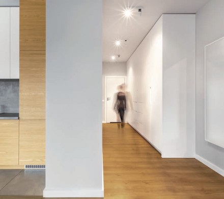 Wybór oświetlenia na domowe szlaki rządzi się swoimi prawami – nie każda z lamp, która nam się podoba, będzie odpowiednia do montażu w wąskim korytarzu, niewielkim wiatrołapie czy na schodach. Sprawdzą się takie, które dają rozproszone, dyskretne światło. Jeśli decydujemy się na montaż lamp sufitowych, wybierzmy plafoniery. To oprawy, które łączy to, że ich klosze są niskie, bez problemu kupimy lampy np. o wysokości 5-15 cm. Dzięki temu po zamontowaniu lampy mamy gwarancję,że w wąskim korytarzu nie zahaczymy o nią skrzydłem otwieranych drzwi. Ich atutem jest zazwyczaj neutralne, często minimalistyczne wzornictwo, chociaż zwolennicy stylowej klasyki czy art déco także znajdą plafony do wymarzonej aranżacji. W strefie komunikacyjnej często instaluje się też spoty sufitowe, czyli niewielkie punktowe oprawy idealnie pasujące do budowania rytmicznej, szeregowej kompozycji świetlnej. Na domowych traktach warto też zaplanować instalację pod montaż kinkietów. Światło sączące się zza tych opraw nie jest agresywne, a przy tym dodaje wnętrzom głębi, co w monotonnej strefie komunikacyjnej ma znaczenie. Zwróćmy też uwagę na walory funkcjonalne i estetyczne opraw LED-owych montowanych na ścianach, ale tuż nad posadzką. Są one płaskie (określa się je jako płytki LED-owe) i odporne na uderzenia. Wykorzystuje się je najczęściej w korytarzu, przedpokoju, a także na schodach. Lampy tego rodzaju dostarczają światło dość precyzyjnie w określone miejsca, co ma szczególne znaczenie w przypadku schodów. W tym miejscu oświetlenie dolne warto zaplanować tak, by podświetlało stopnice.