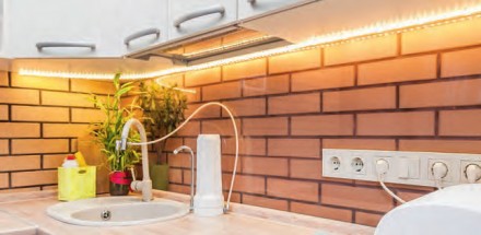 We wnętrzach przeważnie wykorzystujemy taśmy przystosowane do napięcia 12 V. Najczęściej stosujemy zewnętrzny zasilacz, którego montaż wymaga odpowiednio dużo przestrzeni – po instalacji zasilacza najlepiej miejsce montażu zamaskować, tak aby było niewidoczne. Jeśli tam, gdzie zaplanowaliśmy usytuowanie zasilacza nie ma przygotowanego zasilania, należy je doprowadzić z puszki rozdzielczej lub najbliższego gniazdka. Trzeba też pamiętać, że jeden zasilacz wystarcza na 6 m taśmy. Gdy planujemy więcej oświetlenia liniowego, konieczna będzie większa liczba zasilaczy. Jednak dzisiaj podłączenie do stałego źródła prądu nie jest już koniecznością, na rynku są dostępne taśmy z opcją zasilania bateryjnego. Taśmy z diodami RGB wymagają sterownika. Jeśli nie ukryjemy w bruzdach ściennych lub w pustce pod okładziną z płyt g-k instalacji, zasilacza, sterownika czy przewodów, pozostaną one widoczne i będą szpecić wnętrze, a efekt estetyczny będzie bardzo połowiczny. Taśmy LED najlepiej montować w profilach aluminiowych, które dobrze odprowadzają ciepło i wydłużają ich żywotność. W przypadku, gdy zostaną przyklejone bezpośrednio do drewna, płyt kartonowo-gipsowych lub ściany murowanej tracą szybciej nie tylko trwałość, ale też moc świecenia.
